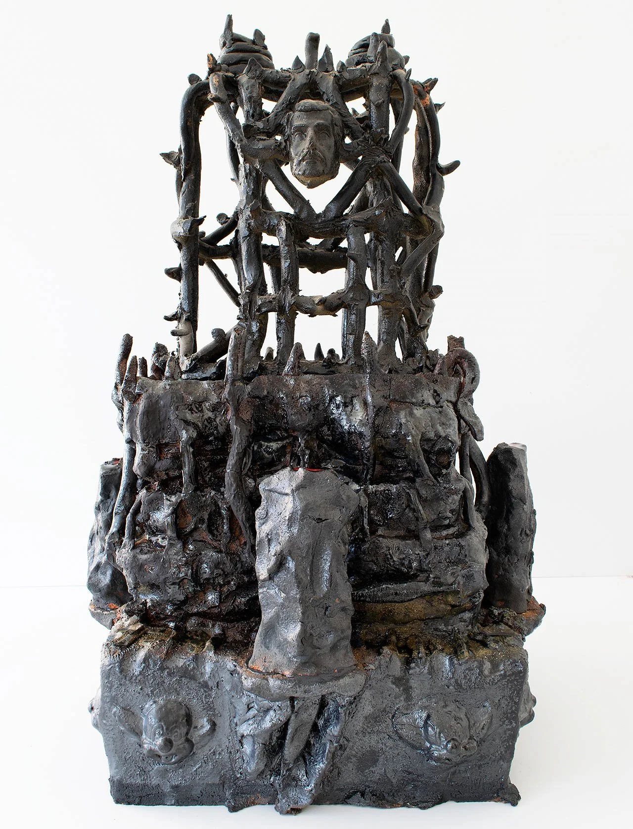 Christian Vargas (b.1986 in Fresno, CA) creates structures and vessels reminiscent of ancient ruins unearthed from the landscape. Rooted in the present, Vargas explores his connection to California’s Central Valley through material, color and texture. His sculptures explore the tension between the sacred and the mundane, reimagining icons in materials like clay, plaster, cardboard and bronze. Often embellished with objects sourced from swap meets and estate sales, his works are layered with meaning and symbolism.