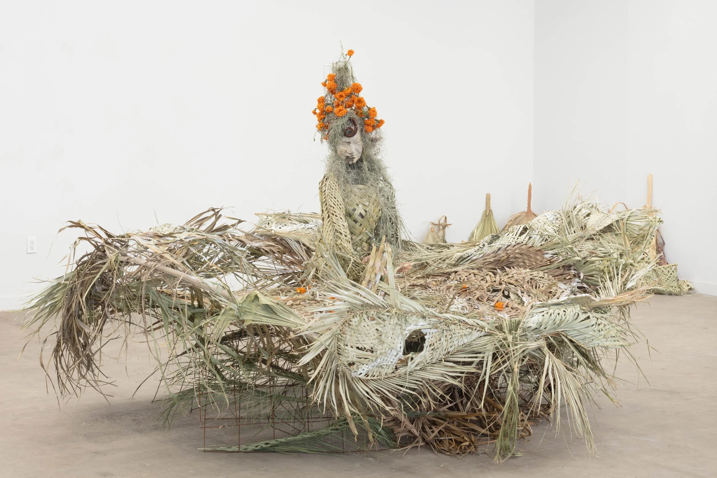 Maria Maea (b. 1988, Long Beach, CA) utilizes assemblage and process-based figurative sculptures and installations to illuminate the relationship between land and the body, specifically focused on narratives around immigrant families and their labor in Los Angeles. Her research focuses on equitable futures and climate justice through food and water accessibility in marginalized communities. Through her use of materials such as concrete, rebar, found objects, fruiting plants, seeds, and woven palm fronds foraged across Los Angeles, Maea creates future ancestor sculptures that act as intimate portraits of family and community as well as abstract cartography of the LA urban landscape. Many of her works structurally contain seed pods that over time will crumble to dust, leaving only the viable seed behind. Through the act of propagation and stewardship the artworks become multi-generational. These works seek to expand and complicate our relationship to issues around justice, stewardship, contamination and preservation.