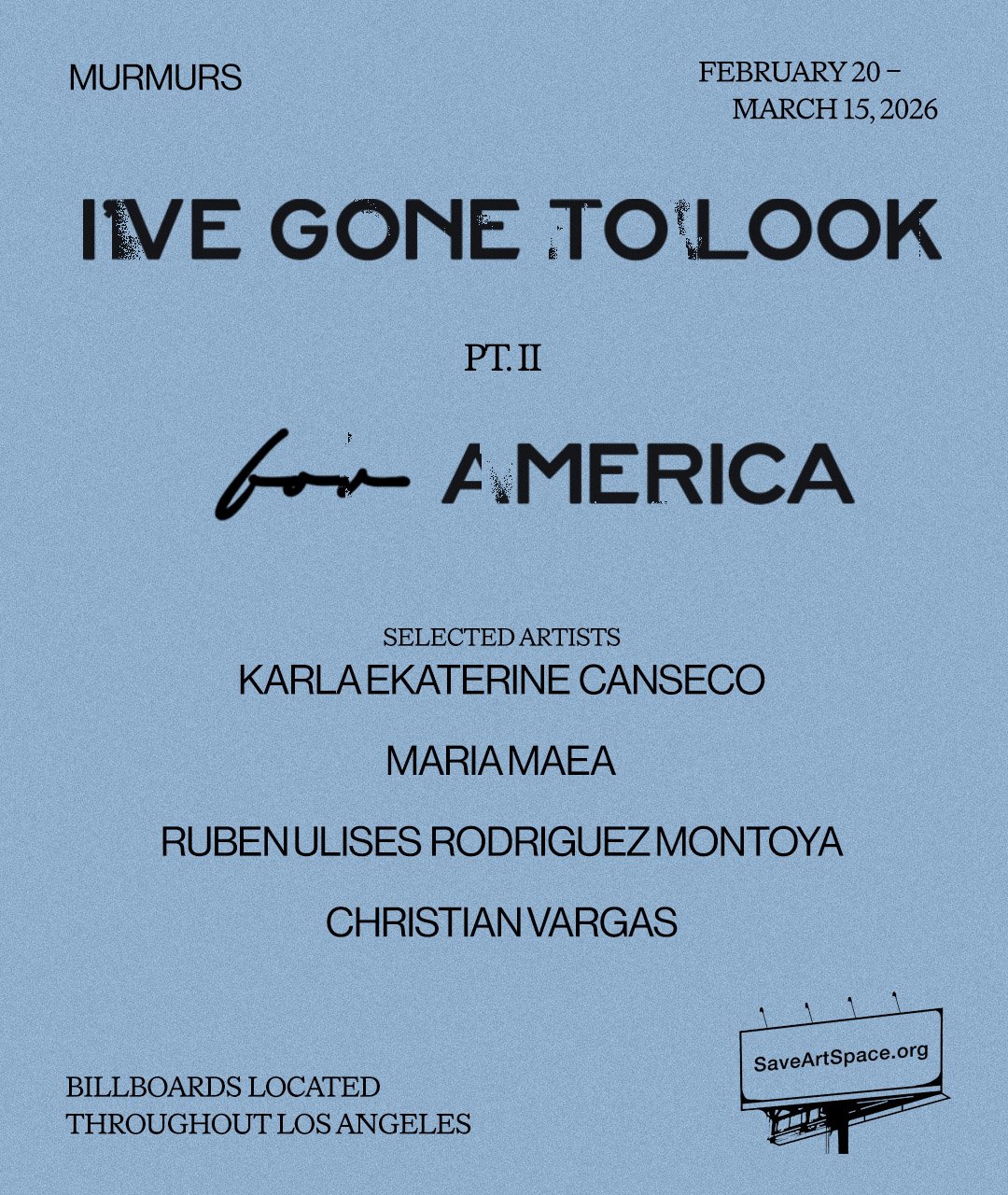 SaveArtSpace x Murmurs is proud to present I’ve Gone to Look for America, a group public art exhibition on billboard ad space in Los Angeles, CA, opening February 20, 2026, curated by Morgan Elder & Allison Littrell.