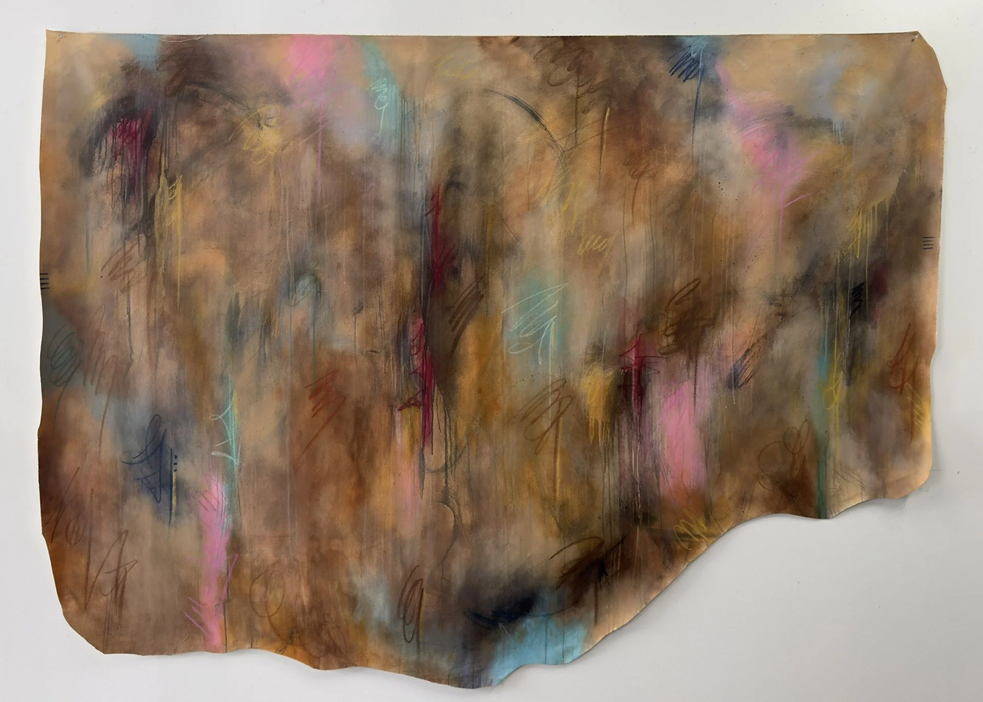 Each painting begins with a black underpainting, a subtle yet intentional deconstruction of Western narratives surrounding aesthetics, purity, and beauty. This foundational layer positions Blackness not as absence, but as origin, depth, and ground. From this base, I build surfaces through layered applications of acrylic paint, interior paint, wood stains, oil pastels, and pencil. Earth tones drawn from melanin-rich skin palettes anchor the work in both the body and the land, while expressive mark-making accumulates as traces of labor, rhythm, and presence.
